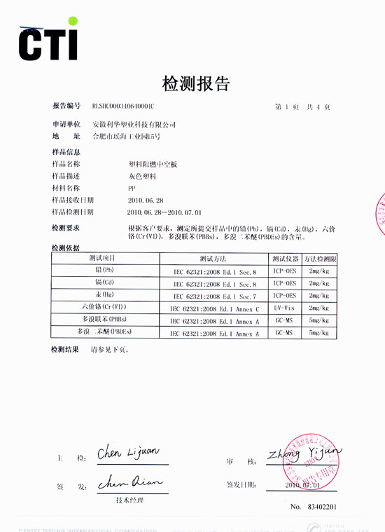 塑料阻燃中空板检测报告1